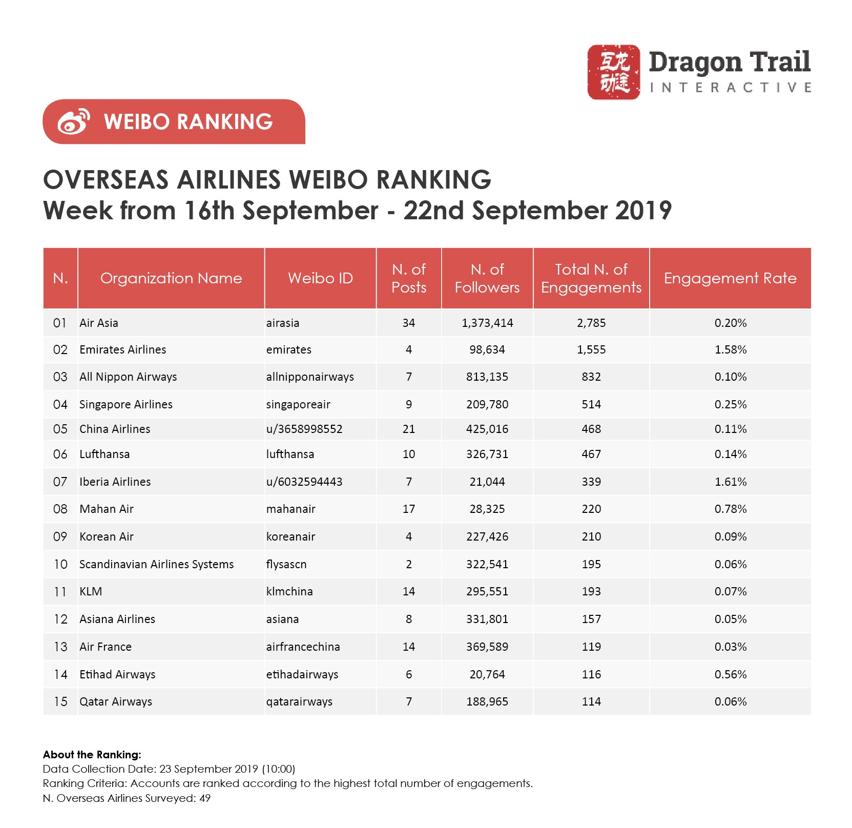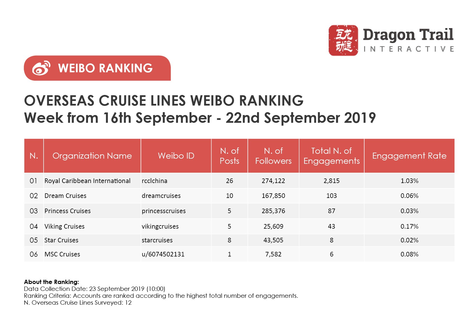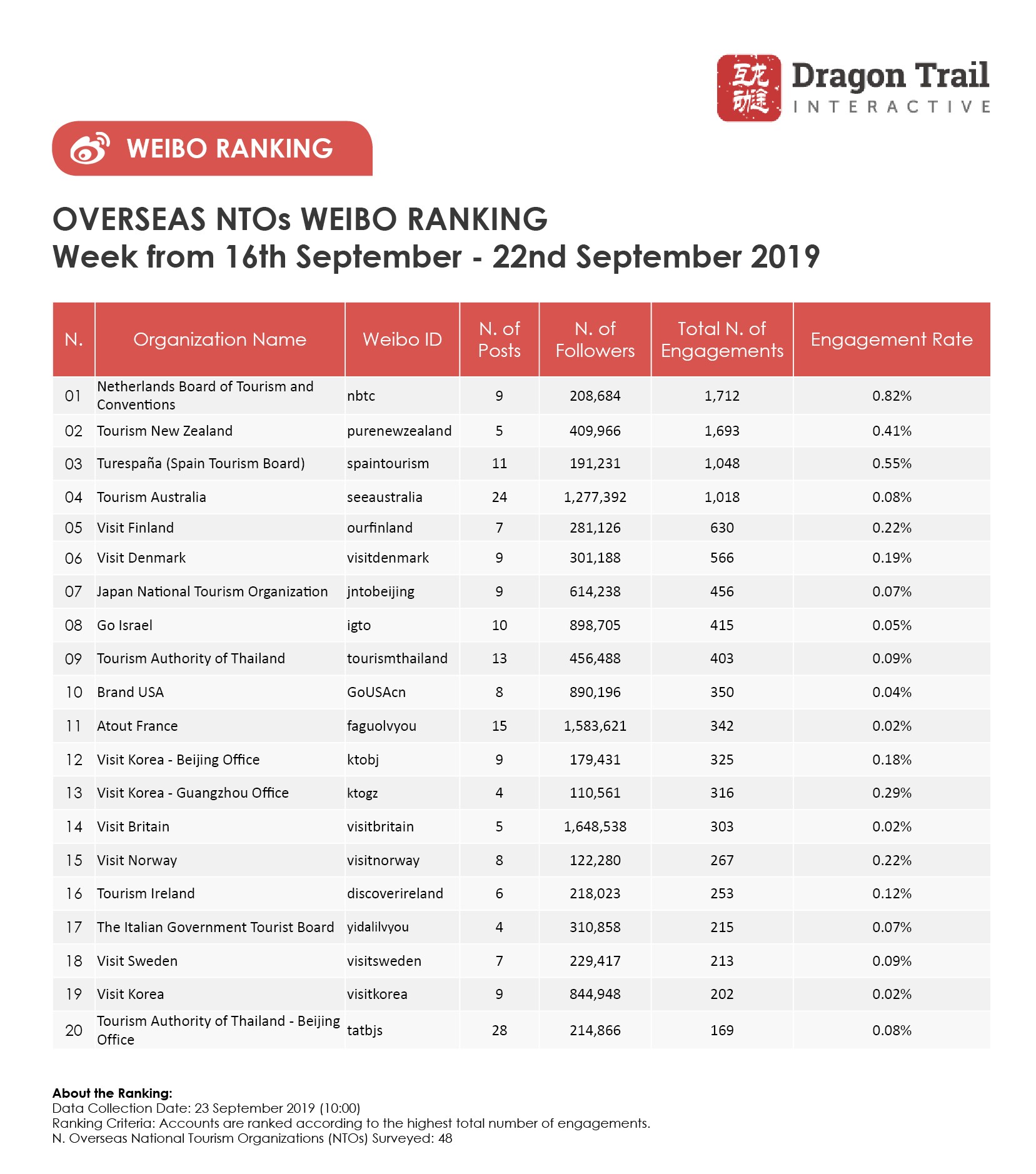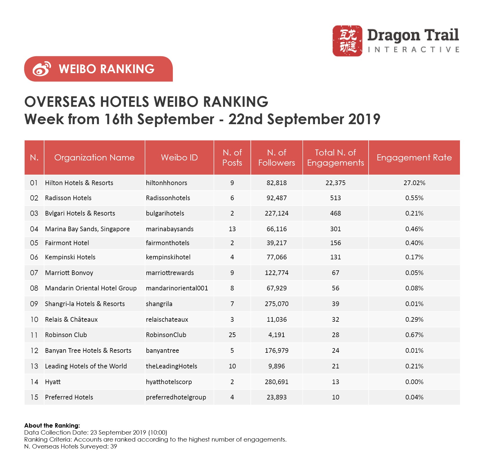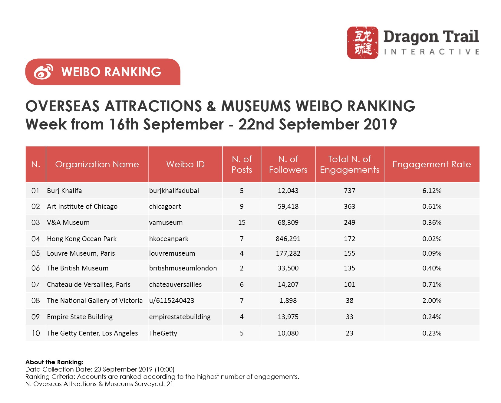 The top-ranking Weibo accounts for travel destinations, airlines, cruise lines, museums & attractions, and hotels, for the week of 16 September-22 September, 2019.
