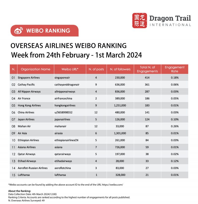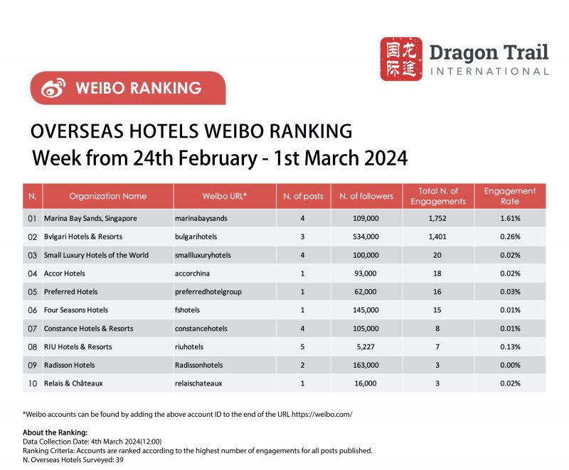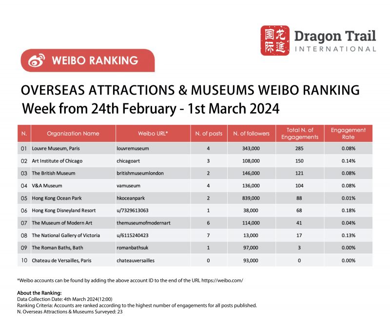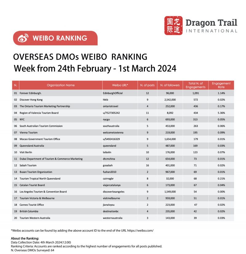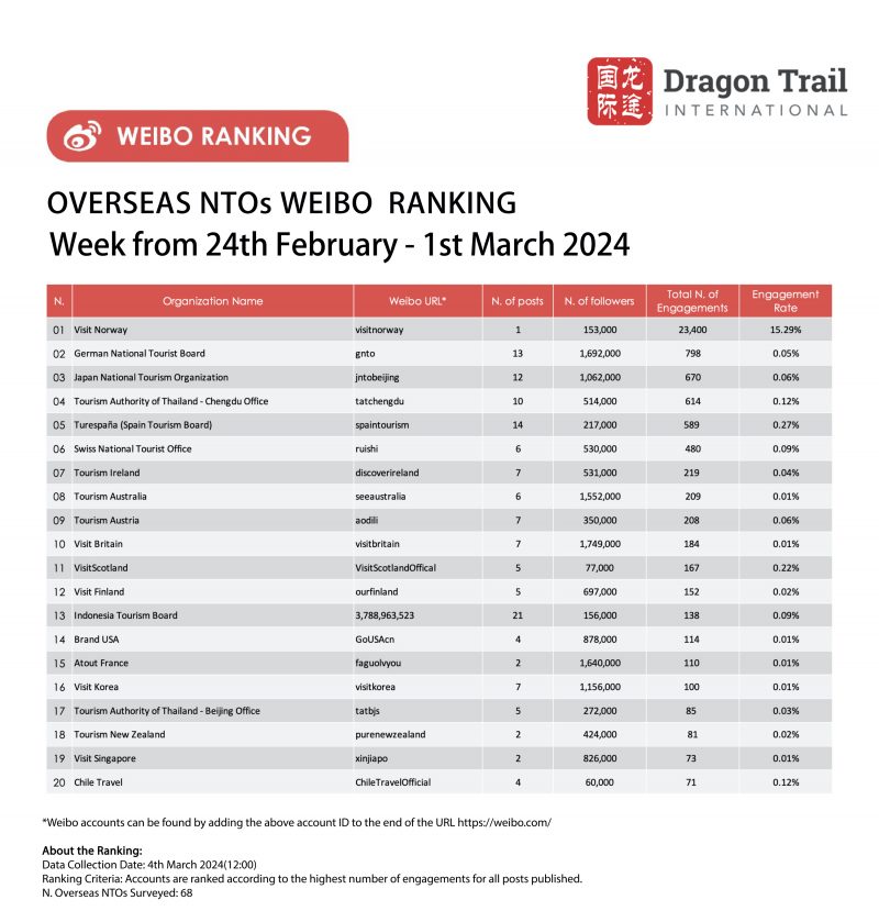The top-ranking Weibo accounts for travel destinations, airlines, cruise lines, museums & attractions, and hotels, for the week of 24 February-1 March 2024.