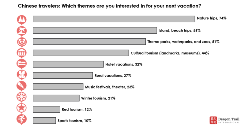 Nature (74%) and island and beach trips (56%) were the most sought after themes for domestic travel. While outbound tourism is still not possible, Dragon Trail’s survey also revealed a desire for international beach and island travel – at 65%, it was the second most popular activity that respondents said they wanted to do on their next outbound trip. For domestic trips, travelers are also interested in typically crowded attractions such as theme parks (51%) and landmarks and museums (44%).