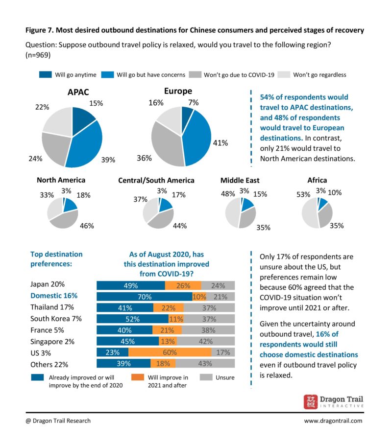 4. APAC and European destinations will be top-of-mind for Chinese outbound travelers, as perception of safety will strongly influence preferences for each destination. Supposing travel policy is relaxed for outbound travel, Chinese consumers will be looking for information related to destinations’ coronavirus situations, accessibility and clear guidelines around pandemic control, including testing, vaccination (if available) and quarantine.