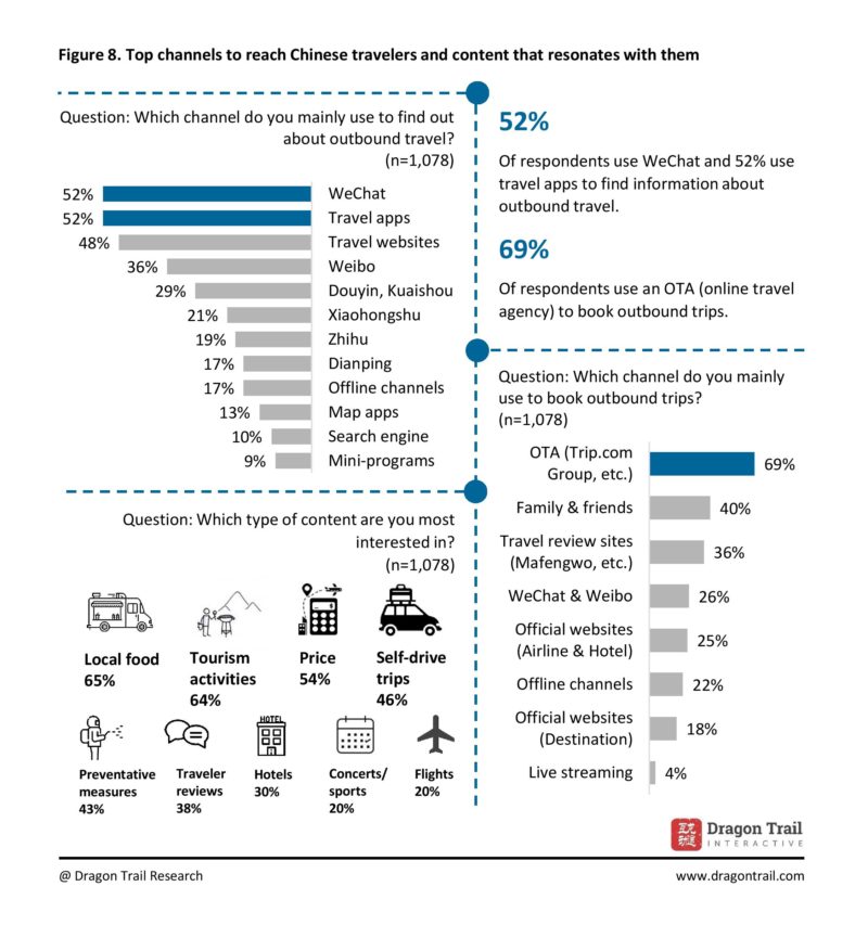 6. Mobile channels such as WeChat and travel apps are equally important for inspiring Chinese consumers to travel. Content that resonates with Chinese consumers are local food, tourism activities, price, self-driving trips and preventative measures. OTAs (online travel agency) are the top channel for booking trips, followed by friends and family.